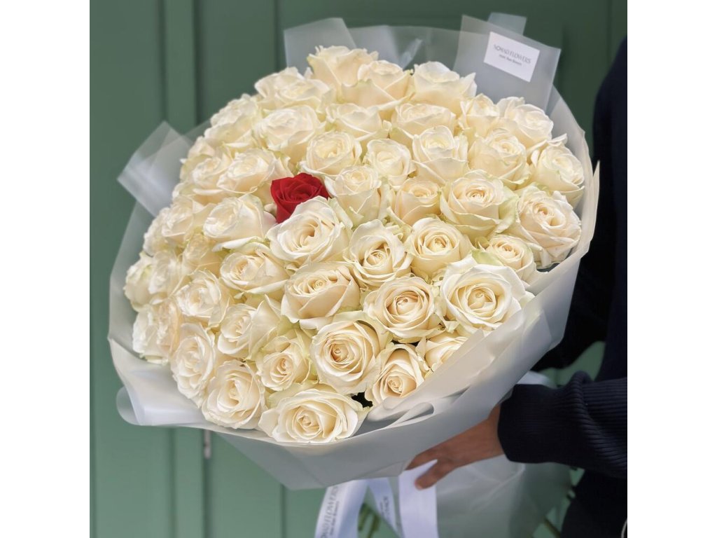 Don’t feel like experimenting with flowers? 🤍 Then white roses are exactly what she’ll love! We can prepare 51 white roses, or add one red rose like in the photo. Only Fresh and Fragrant Flowers.